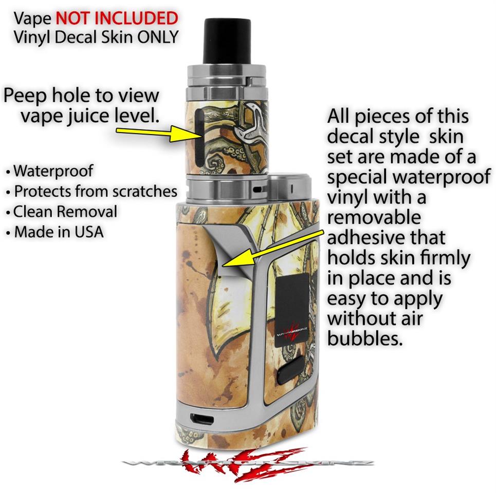 WraptorSkinz® skin wraps are printed using superb photo quality designs and vibrant colors printed with special fade resistant inks that last even in direct sun for years. WraptorSkinz are a composite of two layers of commercial grade materials. The bottom layer is a soft, flexible vinyl with a special removable adhesive that is easily positioned, applied without air bubbles. Next we print the bottom layer with UV protected, fade resistant inks that deliver superb photo quality designs in vibrant colors. Finally we bond a professional grade laminate over the entire skin adding a glossy protective finish. This product is not affiliated with or endorsed by the Smok brand.