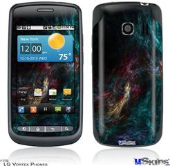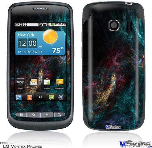 Skin covers front and back of LG Vortex cell phone.