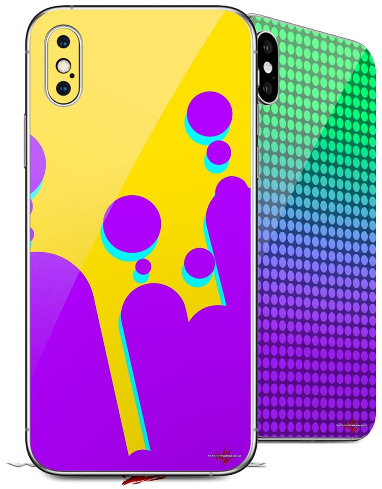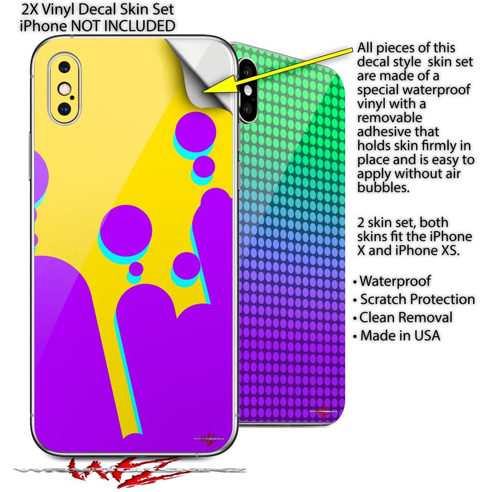 2 Decal style Skin Wraps set for Apple iPhone X and XS Drip Purple Yellow Teal