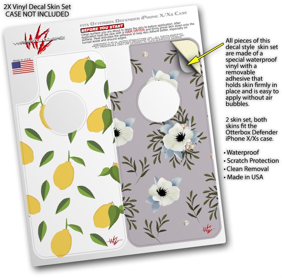 2x Decal style Skin Wrap Set compatible with Otterbox Defender iPhone X and Xs Case - Lemon Leaves White (CASE NOT INCLUDED)