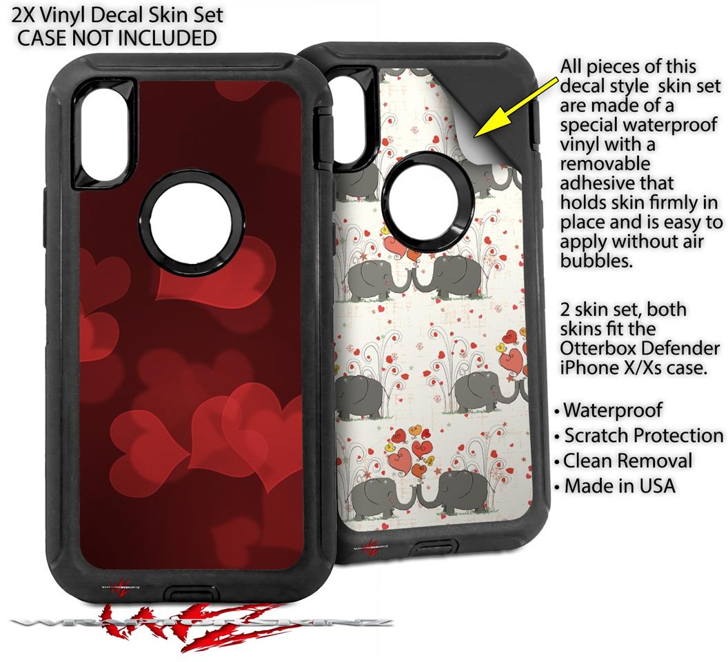 2x Decal style Skin Wrap Set compatible with Otterbox Defender iPhone X and Xs Case - Bokeh Hearts Red (CASE NOT INCLUDED)