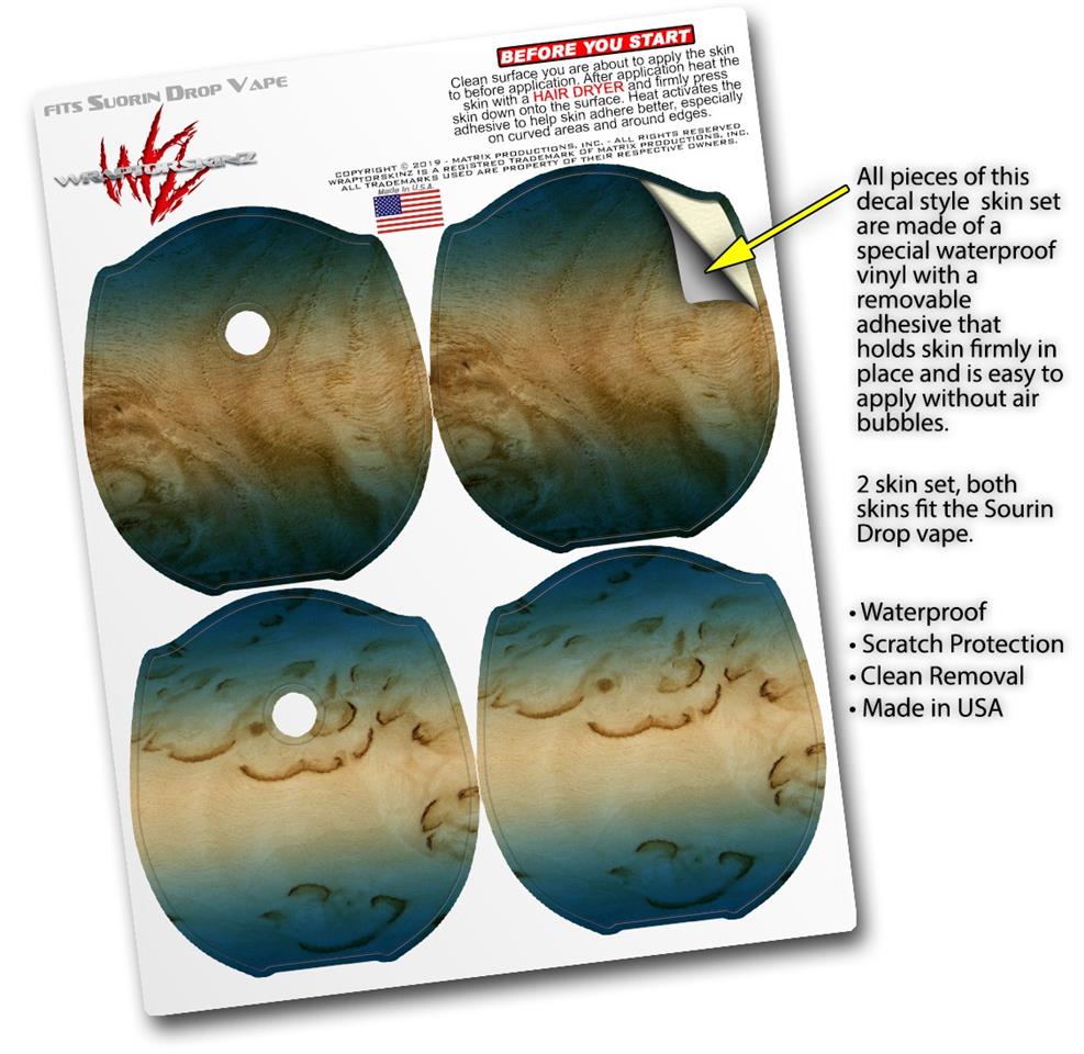 WraptorSkinz® skin wraps compatible with Suorin Drop Vape are printed using superb photo quality designs and vibrant colors printed with special fade resistant inks that last even in direct sun for years. WraptorSkinz are a composite of two layers of commercial grade materials. The bottom layer is a soft, flexible vinyl with a special removable adhesive that is easily positioned, applied without air bubbles. Next, we print the bottom layer with UV protected, fade resistant inks that deliver superb photo quality designs in vibrant colors. Finally, we bond a professional grade laminate over the entire skin adding a glossy protective finish. This product is not affiliated with or endorsed by Suorin.
