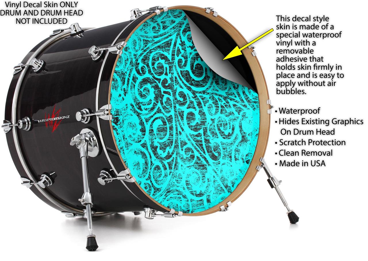 Decal Skin works with most 24" Bass Kick Drum Heads Folder Doodles Neon Teal - DRUM HEAD NOT INCLUDED