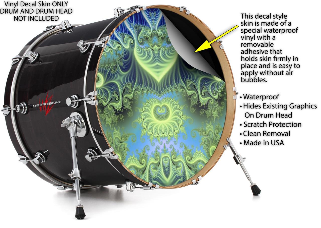 This design also available in other sizes. WraptorSkinz® skin wraps compatible with most kick drum heads. Printed using superb photo quality designs and vibrant colors printed with special fade resistant inks that last even in direct sun for years. WraptorSkinz are a composite three layer commercial grade materials vinyl. The bottom layer is a air release, grey block out removable adhesive that hides existing graphics on the drum head and is easily applied without air bubbles. The middle layer is a flexible vinyl printed with UV protected, fade resistant inks that deliver superb photo quality designs in vibrant colors. Finally, we bond a professional grade laminate over the entire skin adding a glossy protective finish.