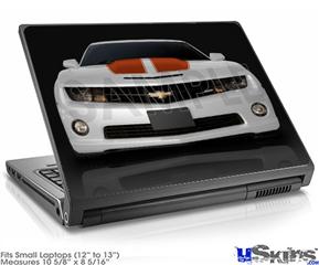 Laptop Skin (Small) - 2010 Chevy Camaro White - Orange Stripes on Black