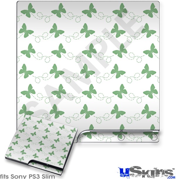 Decal Skin compatible with Sony PS3 Slim Pastel Butterflies Green on White