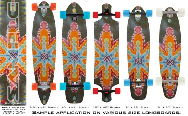 Our longboard skins are made so that one size fits boards up to 10” wide x 42” long. This means after applying the skin it you will trimming to fit you’re the shape of your board with a sharp utility knife.